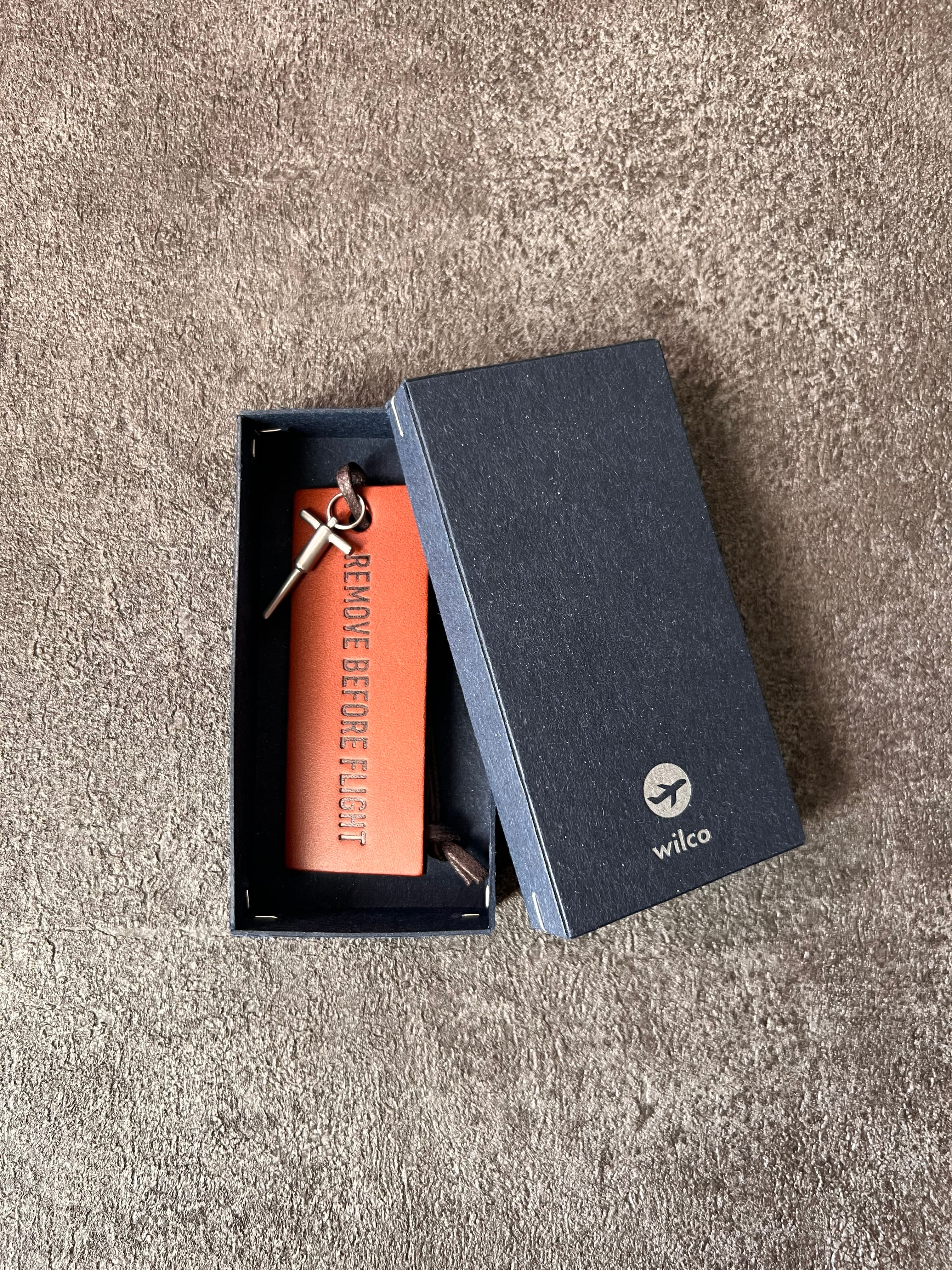航空グッズの中でも人気の「RBF」のタグをレザーで仕上げ、実際にB747に使われているロックアウトピンを細部まで再現しました。